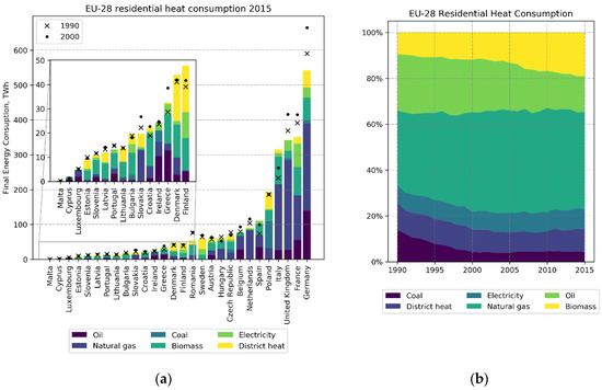 (a) Final energy consumption for residential heat consumption in the EU-28 in 2015. MSs with residential heat consumption lower than 50 TWh are enlarged in the inset. The residential heat consumption from 1990 and 2000 is included to show the development of final energy consumption for residential heating. (b) Development of final energy consumption share for residential heating in the EU-28 from 1990–2015.