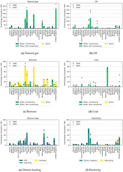 Final residential heat consumption for each EU-28 MS by type of end-use residential heat technology for (a) Natural gas, (b) Oil, (c) Biomass, (d) Coal, (e) District heating, and (f) Electricity. Note: (a) and (b) have a different x-axis scale than the remaining figures.