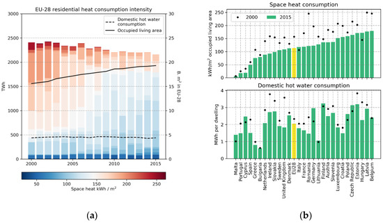 (a) Development of EU-28 total residential heat consumption from 2000 to 2015 (left y-axis), split into MS average heat consumption intensity per m2, and development of occupied residential living area (right y-axis). (b) Residential space heat consumption per occupied living area and domestic hot water consumption per dwelling for each MS in 2015 with a reference value for year 2000. MSs are sorted based on space heat consumption per occupied living area in 2015.