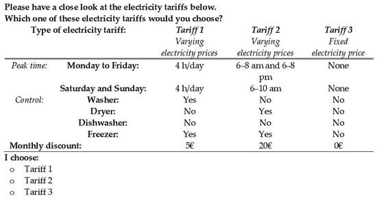 In the questionnaire, we first briefly introduced our survey topic and asked a few screen-out questions to ensure an approximate representativeness of the German population regarding age, gender, and region. Second, we continued with some warm-up questions about a households’ electricity consumption, their current electricity tariff, and their home’s equipment with electric heating, and private microgeneration, e.g., solar panels.