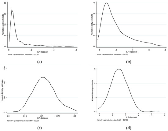 13], who used an elimination-by aspects-model, we use respondents’ ILP estimates from the MXL model to investigate simplifying decision strategies. Since WTA is the marginal rate of substitution between attribute coefficient and price coefficient, systematic differences in the marginal utility of discount resulting from strategic behavior, for example, might systematically lead to differences in WTA estimates. We identify those differences using a kernel density estimation of respondents’ ILPs from our MXL model output, which illustrates their statistical distribution. If this distribution exhibits multiple local maxima, instead of only one global maximum, those estimates are not from the same distribution. Thus, the way respondents react to offered discounts, e.g., following always the same pattern would be an additional cause of variance in WTA estimates.
