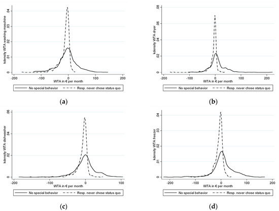 In the following, we investigate how the decision strategies of these four respondent groups affect the WTA estimates. We, again, use kernel density estimations, but now by respondent group.