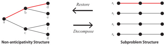 In (16), the representative formulation of DD is presented, where is set of variables for each scenario subproblem, and is the corresponding scenario, and separated variables is equal to the node solution , which is the NC. The structure of scenario tree and subproblems are presented in Figure 1, where DD can divide the scenario tree horizontally so the number of subproblems is determined by the number of branches. In the same figure, if the NC for , which is the solution of node b is satisfied in the corresponding subproblems, then it is also satisfied for the second stage variable in subproblems and , such that . However, NC cannot be presupposed since is the optimal solution of MSSP. DD methods add a relaxed form of NC in the objective function in (16) to mitigate the constraint.