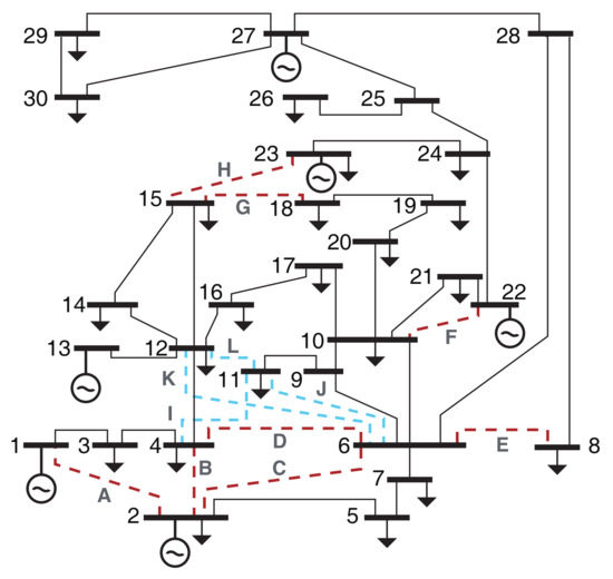 IEEE 30-bus system, red and blue dotted lines are expected candidates for new construction.