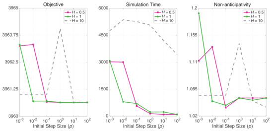 Given NC coefficient in Figure 5, different simulation results were observed according to the initial step size. When the initial step size is very low or is very large (grey), simulations take more steps with little improvements to the solution. Iterations wasted to draw redundant cutting planes take a long time to deduce the dual function. On the contrary, immediate terminations were observed for the highest p of 100 respective to and 1 . However, they did not perform the best on the NC results since expected new boundary of the dual function was not able to be improved without changes of dual variable . Among results with the same (green, magenta), the step size performs the best for the NC and objective. As a result, we verified that the wrong choice for parameters can bring premature termination or expensive termination. It is difficult to distinguish which cost performs the best as the process is premised to incline from the minimum to the maximum, yet the original problem involves minimisation. Thus, we excluded the high costs that violated the NC from acceptable solutions.