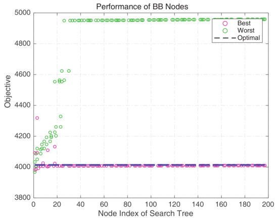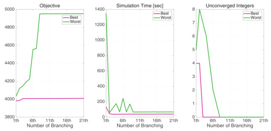 Intermediate n-th branching results until they are fathomed are marked in Figure 6, where the best and the worst are distinguished. The best case can quickly converge integer variables with low additional cost for the NC, which support the objective function closely approaching to the optimal value. However, the result highlights the importance of first branching nodes, and objectives increased by the NC do not always guarantee the optimal solution. In Figure 7, results for every node in the branching tree are marked, in which nodes are distinguished, following the best case or the worst case. There were significant differences between the two groups. First, the best-case nodes converge close to the optimal cost, however, the worst-case nodes dramatically increase for the first few branchings and produce an overestimated cost. Second, the worst-case nodes spend more time solving additional PB processes to converge the integer variables. Therefore, the quality of the objective function is not guaranteed if we follow the worst branching results and this is determined from almost the first branching.