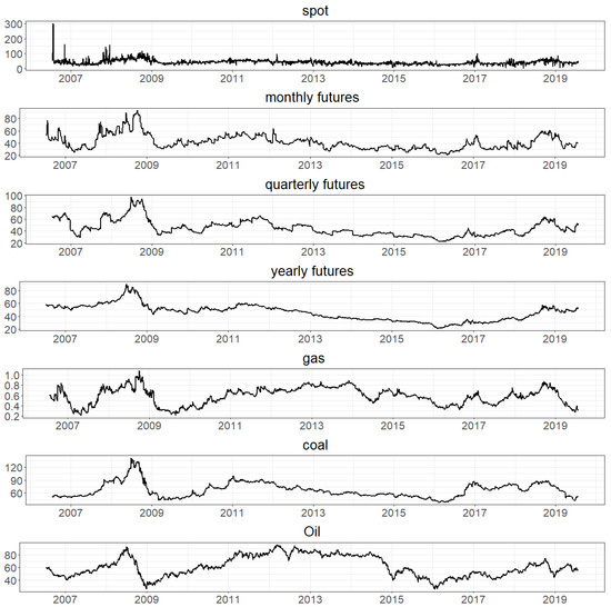In this study, we use data from three fossil fuels markets: natural gas, coal, and crude oil; and four electricity markets: the electricity spot market and the monthly, quarterly, and yearly electricity futures markets. We employ daily data for the period from 2 January 2007, to 2 January 2019, with a total of 3019 observations. These data have been converted local currencies into euros at the daily exchange rate. All variables we used are listed in Table 3.