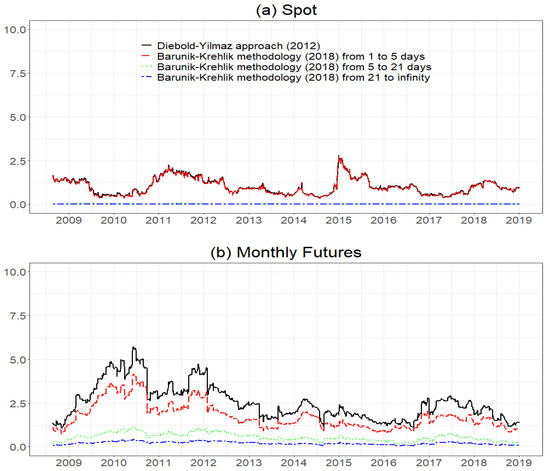 Barunik and Krehlik [1] proposed a methodology that could decompose the spillover index in the Diebold–Yilmaz approach on the specific frequency bands.