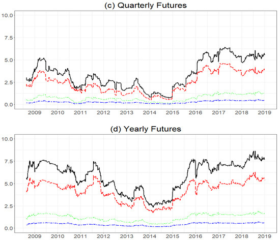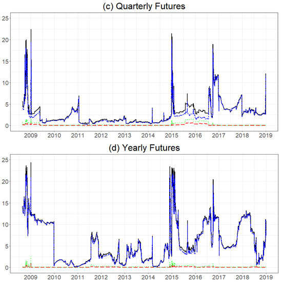 Second, it is interesting to note that the most significant return spillover effects are seen in yearly electricity futures, followed by the spillover effect to quarterly futures, then monthly futures. The return spillovers from fossil fuel commodities is the least in the electricity spot market. Under the assumption of storage costs mentioned earlier, when an electricity producer sells an electricity futures contract with a long delivery period, they would prefer to purchase futures contracts on underlying fuel commodities, rather than purchase them in the spot market and store until the delivery period. This implies that the return spillovers from fuel futures to electricity futures with a long delivery period are higher than to electricity futures with a short delivery period. Mosquera-López and Nursimulu [10] explored the drivers of German electricity prices in spot and futures markets and found that spot prices are determined by renewable energy infeed and electricity demand, while in futures markets prices are determined by the price of fossil fuels such as natural gas, coal, and carbon. This may explain why the return spillovers from fossil fuel commodities to electricity futures are higher than to electricity spot prices.