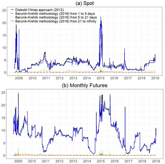 In this study, we analyze the return and volatility spillovers from the fossil fuel market commodities of natural gas, coal, and crude oil, to electricity spot and futures markets in Europe, by using two new empirical methods in the time-frequency domain: (1) the Diebold–Yilmaz approach; and (2) the Barunik and Krehlik methodology. The Diebold–Yilmaz approach was proposed in Diebold and Yilmaz [16] and developed in Diebold and Yilmaz [17]. In the Diebold–Yilmaz approach, the spillover index can be constructed based on the variance decomposition of forecast error, which allows for the study of the spillover effect with a fixed investment horizon in a quantitative way. However, investors have to consider different investment horizons when they make investment decisions because shocks may have different effects in the short and long term. For this reason, Barunik and Krehlik [18] used the Fourier transform to convert the Diebold–Yilmaz approach into the frequency domain so that the spillover index could be decomposed at different frequencies. Moreover, we can also obtain the time-varying spillover effect by using the moving window method. Many recent studies have used this method to study spillover effects and connectedness between assets, such as Singh et al. [19], Kang and Lee [20], and Malik and Umar [21]. In a more recent study, Lovcha and Perez-Laborda [22] used the Diebold–Yilmaz approach and the Barunik and Krehlik methodology to analyze the volatility connectedness between Henry Hub natural gas and West Texas Intermediate (WTI) crude oil in the time and frequency domains. Lau et al. [23] used the E-GARCH model and the Barunik and Krehlik methodology approach to investigate the return and volatility spillover effects among white precious metals, gold, oil, and global equity.