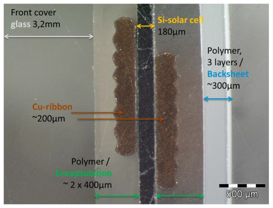 Light microscopic image of the cross section through a standard Photovoltaic (PV) module.