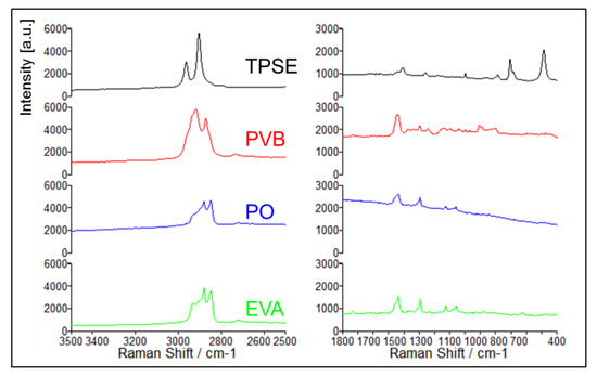 As can be seen in Figure 3, a clear distinction of the most frequently used types of encapsulants is possible. EVA and Polyolefin spectra were distinguishable by the presence/absence of the carbonyl band of the acetate group of EVA at 1740 cm−1 (which was not very intense in the Raman spectra) and the deformation vibration of the acetate at 640 cm−1 [25]. Polyolefins PO and TPO were not distinguishable by their Raman spectra.