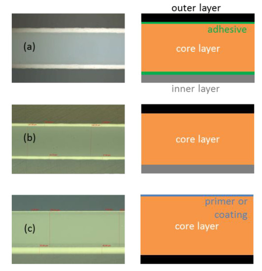 Light microscopic images (left) and schematic representations (right) of three backsheet types: (a) Laminate, (b) coextruded backsheet, and (c) coated core layer.