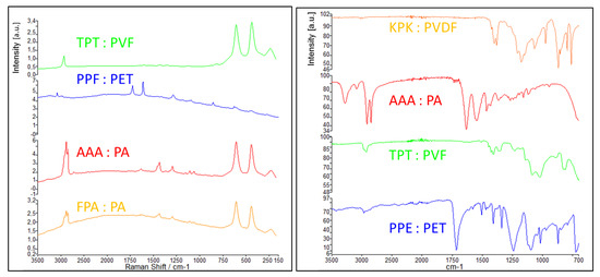 Raman spectra (left) and IR spectra (right) of typical PV backsheets (outer surfaces): TPT (PVF surface), PPF (PET surface), AAA (Polyamide surface), FPA (Polyamide), KPK (PVDF surface).