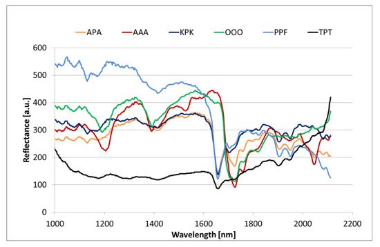 NIR spectra of the typical PV backsheets: APA, AAA, KPK, OOO, PPF, TPT.