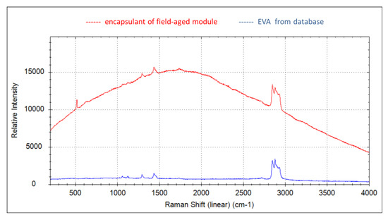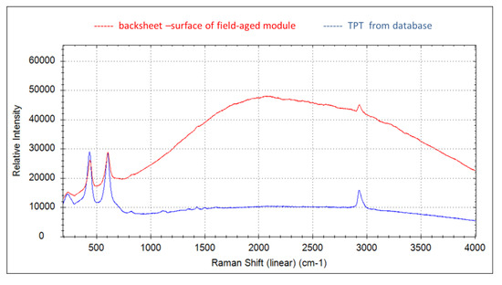 The second problem is the appearance of aging-induced fluorescence of the weathered polymers in the Raman spectra (see Figure 8 and Figure 9). This can strongly affect the detectability of specific absorptions and, thus, impede the assignment of the measured spectrum to the reference spectra stored in the database. As example, the Raman spectra of the backsheet and encapsulant of a 30-year field-aged PV module and the corresponding hit from the database are shown in Figure 8 and Figure 9, respectively. The increasing fluorescence was caused by increasing concentration of fluorophores upon aging and originated from degradation products of the polymer and/or the additives within the polymer. A detailed review on this topic was recently published (see [32] and the references given therein).