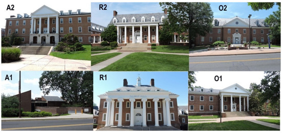 The building types include in this study are academic (educational) buildings (A1, A2), residential buildings (R1, R2) and office buildings (O1, O2). Building floor plans and 3D models are presented in Figure 2. Floor area, building height, year of construction, and year of renovation are listed in Table 2. The total floor area of buildings ranges between 982 m2 to 7015 m2. Floor heights range between 2 stories to 4 stories. The buildings are all over 45 years old, and three buildings have had major renovations since initial construction, while the other three have not.