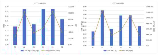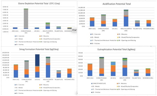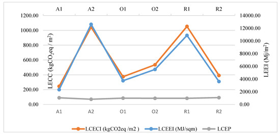 LCEE and LCEI are calculated from input information in Athena. Four environmental impact categories are assessed as well. LCEEI, LCEEC, LCECI, LCECC, LCEP are calculated using Equations (2)–(6), for each of the studied buildings (shown in Table 4).