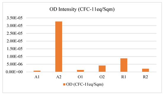 Ozone depletion (OD) potential intensity was looked separately from the other three categories due to its different unit of measurement. Figure 6 shows that building A2 has a substantially higher impact intensity than the other buildings. To investigate this further, we looked into the buildings’ materials and components, which contribute to high OD ratings.