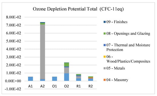 Figure 7 shows that metals (steel and alumina) contribute the most to the ozone depletion potential across all of the buildings. A2 building has a higher metal use compared to other buildings; it uses metals primarily in the building roof, and a portion of the exterior wall is made of alumina panel. However, if we look closely at A2 building materials use (refer to Figure 8), calculated by weight (kg), metal only acounts for 19% of the total material use, but masonry counts for 56% and constitutes a much smaller percentage of the overall ozone depletion potential. Previous research has proven that the most significant factors responsible for ozone depletion are industrial production and disposal of halogenated hydrocarbons [38]. In A2, metal manufacturing and production processes are the hotspots that contribute to a high impact on ozone depletion.