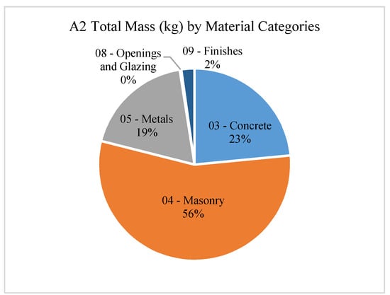 A2 building total mass (kg) by material categories.