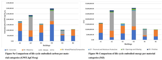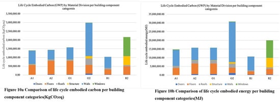 (a) comparison of life cycle embodied carbon per building component categories (KgCO2 eq); (b) comparison of life cycle embodied energy per building component categories (MJ).