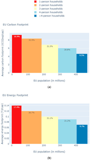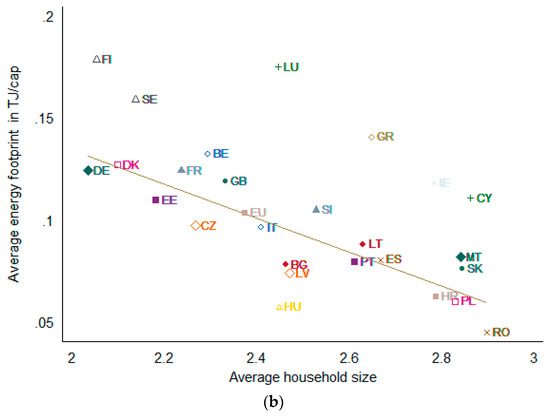 There may be various factors explaining the potential differences in the household economies of scale across EU countries. Some of these are related to the distribution of household size and composition. Adding another member to a household is likely to reduce per capita energy use and carbon footprints at a decreasing rate with rising household size; that is, increasing the household size from one to two members may drastically reduce home energy use and the associated carbon footprint, while a change from three to four members has been shown to produce a smaller effect on average [2]. Furthermore, the household composition—e.g., the age and the gender of the new household member—may also play an important role [3,5].
