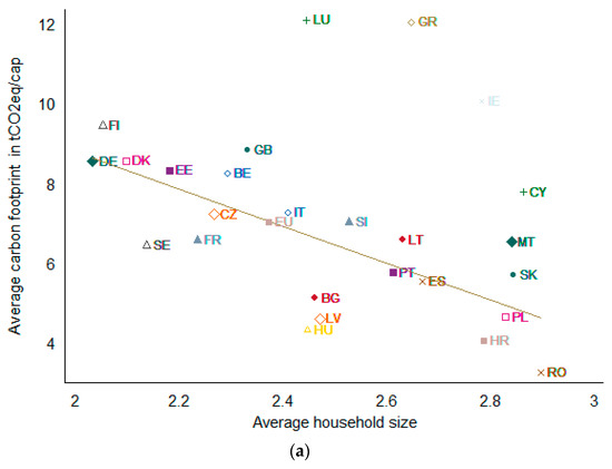 Association between average household size and average per capita carbon (a) and energy (b) footprints in the EU. The carbon footprints are measured in tCO2eq/cap and energy footprints in TJ/cap. Household weights provided by the HBS have been applied.