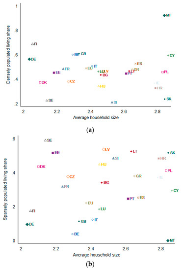 Association between average household size and share of households living in densely (a) and sparsely (b) populated areas in the EU. In cases where the shares do not add up to one, the difference amounts to the share of households living in intermediately populated areas. Household weights provided by the HBS have been applied.