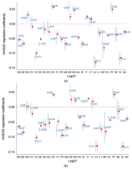 An increase in the EU household size by one member brings about a 5%-reduction in the carbon footprint and 7%-reduction in the energy footprint (Figure 5, in blue). The countries with the strongest household economies of scale include Luxembourg, Slovenia and Czech Republic, described by negative and significant HHSIZE at the 5% level coefficients, ranging from −0.11 to −0.13. The coefficients suggest that an increase in household size by one member decreases the per capita carbon and energy footprint by up to 12% (taking the exponent of the coefficient). Other countries—such as Belgium, Germany, Finland, France and the United Kingdom—are characterized by moderate household economies of scale. Their HHSIZE effects vary between −0.03 and −0.10, suggesting that an increase in the household size by one member reduces per capita carbon and energy footprints by 3–10%.