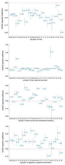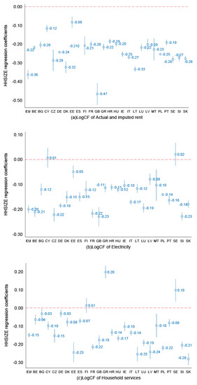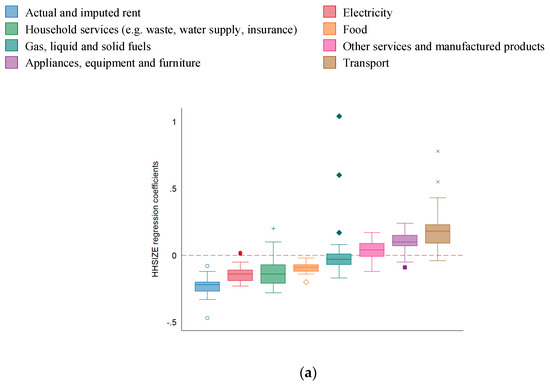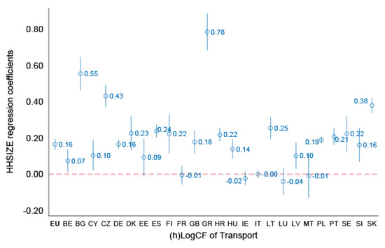 While similar ranges of the household economies of scale are noted for electricity and housing fuels (Figure 6), the strong positive outliers in terms of HHSIZE effects lower the median household economies of scale for housing fuels. We found negative and significant HHSIZE coefficients varying between −0.17 (for Czech Republic) and −0.04 (for Germany and Slovenia) across most EU countries (Figure 7(e)). The positive and significant effects—especially for Malta and Cyprus—could potentially be explained by product allocation inconsistencies of fuel use from marine bunkers [45] (where we do not expect household economies of scale) being inaccurately allocated to household fuels in the national accounts.