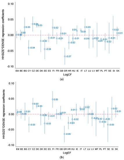 In this section, we discuss the magnitude and significance of interaction effects depicted in Figure 8 (HHSIZE×DENSE) across EU countries (the model in blue in Figure 5, controlling for income, household size, population density and region). The majority of EU countries show insignificant interaction coefficients, suggesting no significant differences in the HHSIZE effect between densely and sparsely populated areas in the EU.