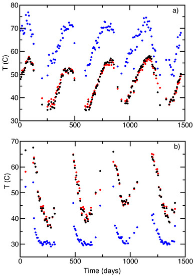Week-averaged model predictions vs. measured temperatures. Day 1 is 1 July 2013 and days begin at midnight. Red and black dots: model predictions and experimental data for (charging) and (discharging). Blue dots: initial condition (charging) or (discharging). (a) Charging periods. (b) Discharging periods.