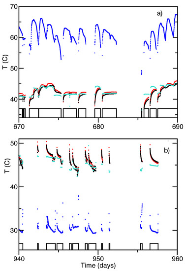 Figure 2 compares the model predictions, averaged over weekly periods, with the data for Years 7–10. Figure 3 shows 10-min data for selected 20-day periods. The model fits the data closely, with a 0.8 C rms deviation. Even rapid variations in are obtained accurately by the full model including the time dependence of and (Equation (3)). For example, in Figure 3a, at time days, charging is turned on abruptly. The ensuing gradual rise in is captured accurately by the full model, but not by a model (turquoise points) with constant and , which gives a more constant temperature after charging begins. The gradual rise in the full model occurs because and are enhanced right after charging begins; this causes a rapid exponential decay of the temperature change along the path of the water, which means that the temperature jump is strongly attenuated at the output. In physical terms, immediately after charging is turned on, the initial heat pulse is absorbed near the input, because heat is transferred very rapidly until the quasi-steady state temperature distribution for the current soil–temperature distribution is built up. The model correctly also predicts that the diurnal oscillations in during charging (Figure 3a) are much smaller than those in , but it still overestimates their magnitude. The quality of fit here appears to be comparable to that of Ref. [6], and better than that of Refs. [14,16].