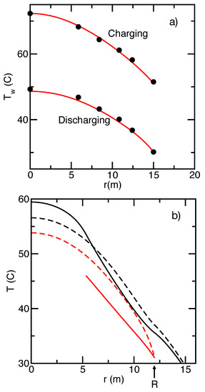 The flow of water through the short-term storage tank is not explicitly treated. Instead, the focus is on energy-storage properties of the borehole array itself. These are determined by the flow rate and the difference between the incoming and outgoing water temperatures. The latter are taken from temperature sensors near the pipes. The time-dependent initial conditions for Equation (6), (charging) or (discharging), are taken from the sensors nearest and . During charging and discharging the model equations are used to calculate and , respectively, and the model is fitted by comparing these predictions to the data. The flow velocity at the cylinder edge is obtained as , where is obtained from the dataset. An asymptotic soil temperature of 8 C is assumed at large distances, as in Ref. [16].