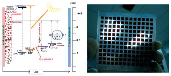 Schematic of the working mechanism of a DSC (Left); A photoelectrode (100 cm2) for a DSSC module (Right). Reproduced from Ref. [45] with permission from The Royal Society of Chemistry.