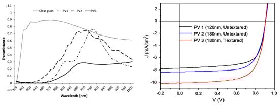Transmission spectrum of semi-transparent devices with different absorption layers (left), and J-V characteristic curve for semi-transparent devices (right). Reprinted from Applied Energy, Volume 129, Y. T. Chae et al., Building energy performance evaluation of building integrated photovoltaic (BIPV) window with semi-transparent solar cells, Pages 217–227, Copyright (2014), with permission from Elsevier.