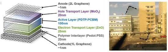 The so-called organic PVs (OPVs), as reported by Krebs et al. [53], can be manufactured using abundant materials, in very thin devices, with an overall thickness of about 100 nm, being susceptible for continuous and cheap printing/coating processes, starting from liquid ink. Transparency in OPVs is once again a compromise between film deposition parameters and captured photons, low resistance, and suitable optical properties. OPVs embody organic layers replacing metals and metal oxides in the role of effective electron/hole transporting layers in a device. Chen et al. [54], report some solution-processable materials, like carbon nanotubes and graphene, replacing transparent conductive oxides, or PEDOT:PSS. In their work, a blend of PBDTT-DPP and PBDTT-PCBM acted as photoactive layers with complementary absorption. These devices reached efficiencies higher than 5%. All of these layers are generally sandwiched between a 100 nm thick metal cathode (or silver nanowires) and a transparent conductive oxide about 150 nm thick [55,56]. The great interest in OPVs worldwide is mainly due to their lightness, semitransparency, and flexibility, which make them quite unique among the innovative power generation technologies. Song et al. recently reported optical transmittance up to 69% (550 nm) [37]: they combined very transparent graphene electrodes with NIR/UV-absorbing organic polymers (Figure 3). Conversion efficiency between 2.8% and 3.8% was achieved for these flexible devices. Kim et al. [39] reported efficiencies of 5–6% for all-polymer solar cells, opening the way to further enhancement.