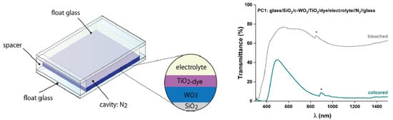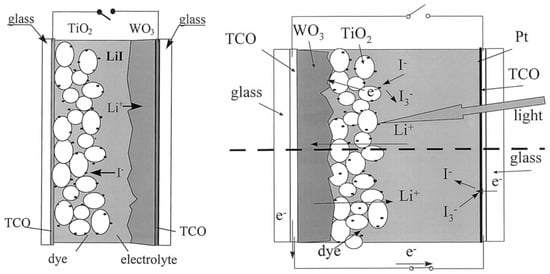 The ideal criterion to analyse PECDs’ evolution in time might be the chronological one: in fact, this approach shows the impact of materials’ evolution on the technological development of PECDs, clearly showing occurring trends in the design of devices and materials. The main influencing factor has been represented so far by the PV technology adopted, in turn affecting the efficiency and durability of PECDs. Differently from photochromic films, this PECD embodied a PV film on its photoanode, being completely separated from the cathodic EC material, by means of a liquid electrolyte: the device hosted a dye-sensitized TiO2 (light absorber) on the photoelectrode and a tungsten trioxide (WO3) layer, deposited on the counter electrode. When irradiated, electrons that were generated on the photoanode moved into the WO3 film (photovoltage in open circuit was about 0.6–0.9 V) via an external circuit, reaching tungsten sites. Subsequently, lithium ions were attracted from the electrolyte. This process allowed for a reversible redox reaction standing at the basis of the coloration process. Later, B. Gregg [21] lowered the iodine content in the electrolyte, in order to maximize the cell photovoltage. Moreover, he opted for a more transparent dye in order to reduce the device absorbance.