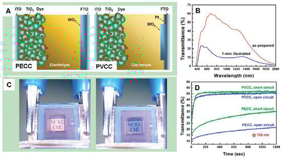 The first photovoltachromic device (PVCD), (i.e., a PECD that was capable of producing more electric energy than the amount strictly needed to activate smart coloration) was disclosed in 2009 in a paper by Wu et al. [103] (Figure 6). The first PVCDs combined the PV features of dye-sensitized cells and those of PECDs, in a separated architecture. A frame-type layout was adopted, to pattern the WO3/Pt counter electrode. When irradiated, the PVCD underwent very fast coloration (4 s) in short-circuit conditions, whereas bleaching occurred in 40 s. Moreover, a fair PV performance (η = 0.50%) was observed. The very fast kinetics was ascribed to the presence of the Pt catalyst.