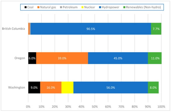 We utilized data from an online survey administered in September 2019 to residents of Washington (WA), Oregon (OR), and British Columbia (BC). This region is known as environmentally progressive, and the public from these states/province generally have higher levels of anthropogenic ascription to global warming and greater support for a carbon tax than some other parts of the U.S. and Canada [16,17]. Furthermore, WA, OR, and BC are at the leading edge of climate and energy policymaking, though this is facilitated in part by the region’s significant hydroelectric capacity (see Figure 1). In 2016, the state of Oregon passed legislation to double the state’s RPS to 50% and retire all coal-fired electricity by 2030 [99], and even more recently, Washington’s Governor passed legislation to aggressively reduce carbon emissions and attain 100% ‘clean’ electricity by 2045 [100]. Oregon’s last coal-fired power unit is slated to shut down in 2020; Washington’s in 2025. In BC, a 2010 rule required 93% of all electricity to come from ‘clean or renewable sources’ [101], and the province has surpassed that goal.