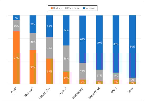 Respondent preferences for eight energy sources, ordered from the least to most preferred (n = 1500). * Indicates significant state/province differences in support (p < 0.001). Respondents in BC were more opposed to coal and nuclear than those in OR and WA. Respondents in OR were more opposed to hydropower than those in WA and BC.