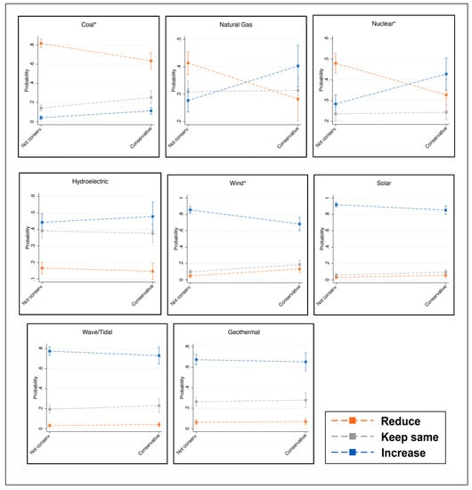 As odds ratios are difficult to interpret in terms of the effect sizes, we have produced a set of predictive margins plots for one explanatory variable to provide a clearer example of model effects. Figure 3 displays eight predictive plots (one per energy source) that compare the relative probabilities for conservatives’ and non-conservatives’ preferences that each energy source be reduced, kept at the same production rate, or increased (holding all other variables in the regression models constant). The plots for coal, natural gas, and nuclear show that conservatives have a lower probability of wanting reduced production of these three energies than non-conservatives, and a higher probability of wanting to increase the use of these three energies. Conservatives were also more likely to say they wanted to keep the use of coal at status quo levels, but this was not the case for natural gas or nuclear, where the two groups did not vary substantially. In the remaining five plots (hydroelectric, wind, solar, wave/tidal, and geothermal), conservatives and non-conservatives were more similar to each other; this is especially the case in the solar, wave/tidal, and geothermal plots where (as evidenced by the very flat lines between the two groups) conservatives and non-conservatives had fairly equal probabilities of indicating all three response options. These plots also show that all respondents had a high probability of wanting to increase the use of solar and a much lower probability of wanting to reduce or keep the use of these energies at the same level. The plot for wind, though similar, shows a slightly different story, with conservatives, compared with non-conservatives, having a lower probability of wanting to increase the use of wind and a higher probability of wanting to reduce wind energy or keep it at the same level. Still, the plot for wind showed that respondents as a whole had a higher probability of wanting to increase, rather than reduce, the use of wind energy. Finally, the plot for hydroelectric showed that conservatives had a higher probability of wanting to increase this energy source and slightly lower probabilities of wanting to reduce or keep the use of this energy the same.