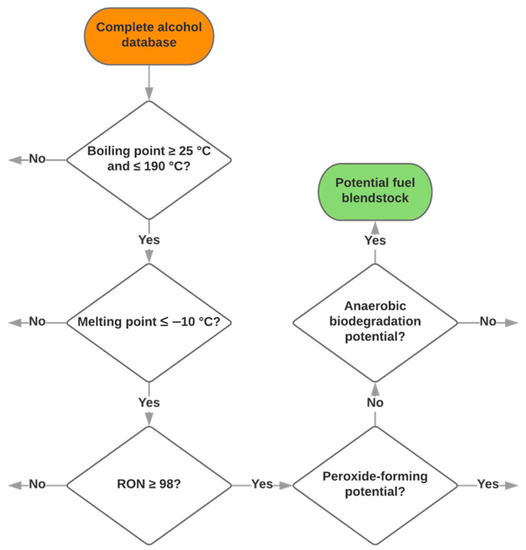 The objective of the initial screening was to eliminate any problematic alcohols that would be unsuitable for current fuel distribution systems or fuel applications in SI engines. To pass this stage, alcohols were required to satisfy the property constraints shown in Table 1 for boiling point, melting point, RON, peroxide formation, and anaerobic biodegradability. The decision tree process for this first stage screening is shown in Figure 1. The rationale for each of the screening values follows.