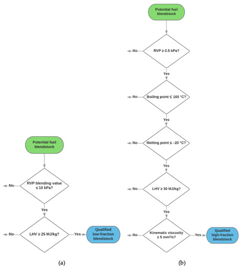 Decision framework for the second-stage screening of the alcohol database. (a) Low-range blends (Scenario 1). (b) High-range blends (Scenario 2).