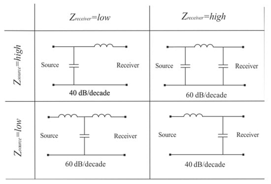 A passive discrete EMI filter (indicated in the following as EMI filter, for brevity) is composed of a CM section and a DM section, whose topologies should be suitably chosen to pursue the desired noise attenuation, but also additional requirements such as safety limits on capacitive current toward the ground, acceptable voltage drops, mismatched impedance conditions, etc. As far as the impedance mismatching is concerned, the knowledge of at least the magnitude of noise source and receiver impedances is important for the preliminary selection of the most appropriate filter topology, which is done according to the criteria shown in Figure 1 [7,20], before proceeding to the filter parameter calculation. This calculation can be done in different ways. According to the conventional EMI filter design procedure, the designer considers only the intrinsic filter attenuation, which is related to the chosen topology as shown in Figure 1, and the filter parameters are obtained starting from the desired noise attenuation at a crucial frequency (usually the attenuation required to reduce the maximum peak in the measured EMI at a level below the standard limit). This approach, even if simple and straightforward, is affected by approximation due to disregarding terminal impedances, thus considering and or vice versa [26]. Therefore, this method can either lead to an oversizing of the EMI filter or non-compliance of the system with standard limits in the whole EMI frequency spectrum (150 kHz–30 MHz).