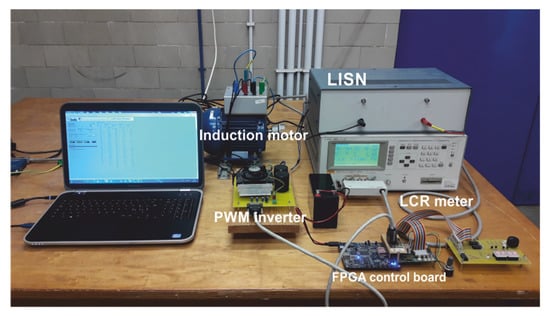 In order to obtain the in-circuit IL of the filter, experimental characterization of the CM and DM terminal impedances in the range of frequency 150 kHz–30 MHz must be performed using a suitable LCR meter. Finally, a radio frequency (RF) clamp current probe and a spectrum analyzer are needed to measure the CM and DM EMI spectra. The main features of the experimental arrangement are reported in Table 1, whereas Figure 4 shows a photo of the experimental setup.