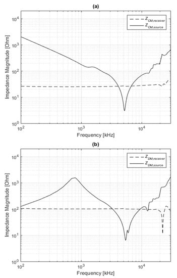 Frequency characteristics of the common mode (CM) noise source/receiver impedance (a); frequency characteristics of the differential mode (DM) noise source/receiver impedance (b).