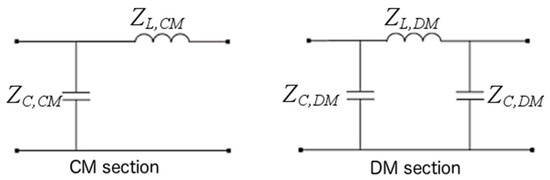 For the sake of simplicity, the analysis considers only single-stage CM and DM EMI filter sections, whose schemes are sketched in Figure 6; with reference to such schemes, the CM and DM EMI filter sections impedance parameters are expressed by Equations (2) and (3), respectively [31]. Finally, it is worth noting that a commonly used notation for filter capacitors is Cx, Cy; for a DC or single-phase AC system, it is Cx = CDM and Cy = CCM/2.