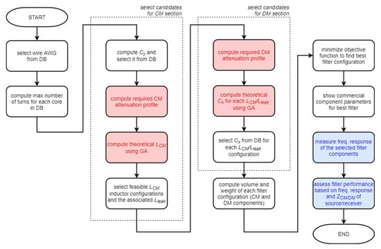 Both procedures, executed offline, take into account the characteristics of the filter application, such as the power electronic circuits and the constraints of the filter design, and exploit DBs of commercial components for the setup of the EMI filters. However, unlike [25], the proposed procedure considers the non-ideal behavior of source and receiver in the design stage; furthermore, it performs a final assessment of filter performance to evaluate the effect of the non-ideal electrical components used. Therefore, it needs more input data and also additional validation data. The flowchart of the proposed procedure is shown in Figure 7, and the different blocks with respect to the flowchart of [25] are highlighted using light red and light blue colors. The input data of the proposed procedure are summarized in Figure 8, highlighting the new required data in red. The same figure also shows the additional data needed for filter assessment, reported in blue font.